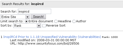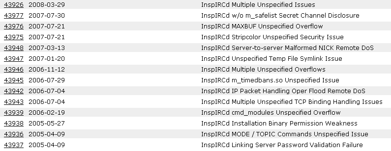 Example: Search your favorite VDB for ”inspircd”, a popular multi-platform IRC daemon. Compare the results of BID, Secunia, ISS X-Force, SecurityTracker, and OSVDB: