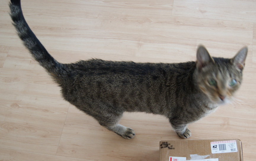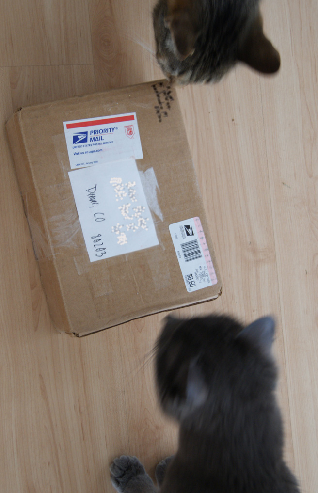 As with all packages, the bomb-sniffing cats had to be given ample time to determine the level of threat. Badger examined the ink for traces of chemical agents and Speedbump went to work on the seams to get an idea of what illicit materials were stashed in the box. Twenty minutes later, Badger looked up at me and gave me the nod. All is well they concluded.