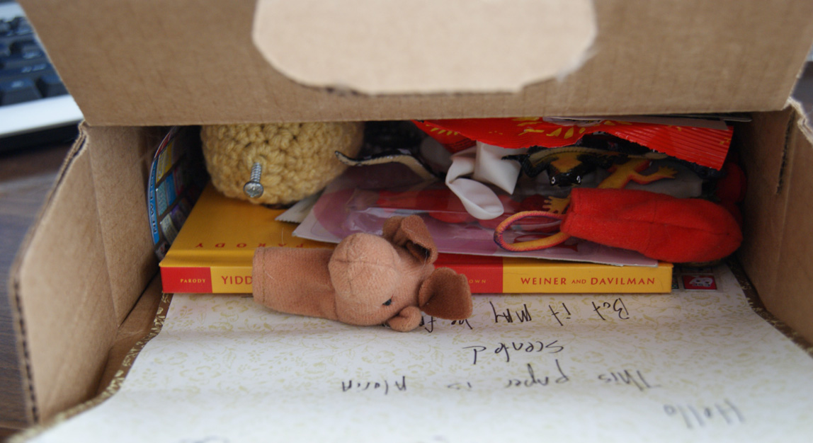 At some point around 2008 I put together a box with a bunch of random shit laying around. Nothing of value, all stuff you question why you even kept it in the first place basically. Off it went to an unsuspecting victim/friend. From there, the box-of-shit was born. Since then, I have sent out hundreds of boxes or envelopes of shit. On occasion, people document what they receive with comedic flair. This is one of the boxes I received and wrote about. This was originally published on attrition.org.