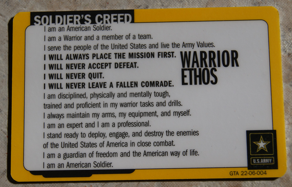The Soldier’s Creed card, to remind me just how far away I am from being a real man. Thanks reminder! I will say that I am proficient with ‘drills’ and stand ready to engage, if you catch my drift.