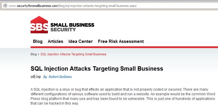 Earlier today, an article appeared on InfosecIsland by Bobby, titled “SQL Injection Attacks Targeting Small Business” (now 404, screenshot). If you read the article, you will immediately see serious flaws if you aren’t rolling on the ground gasping for breath. SQL injection is not a virus, SQLi attacks are still primarily used for stealing data, and updating your operating system will do absolutely nothing to protect you from these attacks. It is abundantly clear that Robert Siciliano is not an expert on computer security. When challenged on this article, Bobby promptly replied blaming someone else: