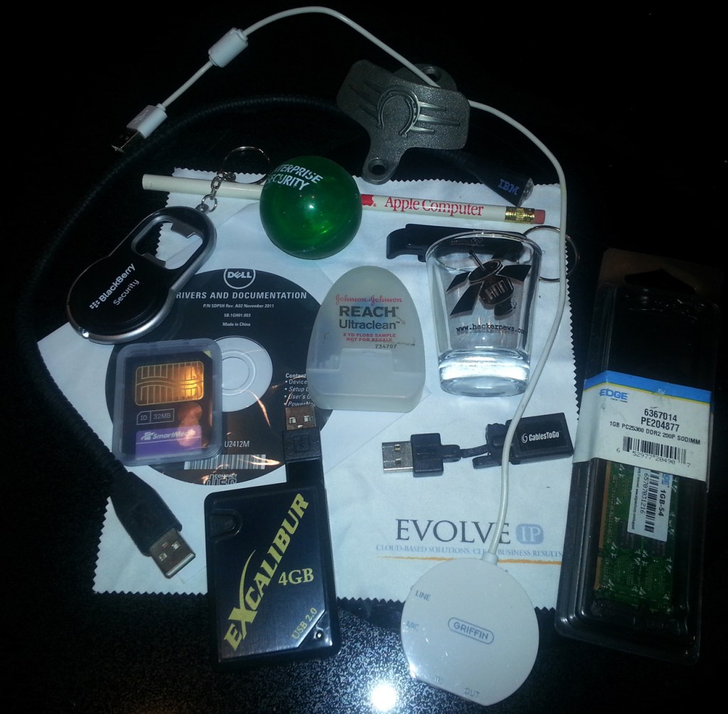 A wall mount bottle opener. This is perfect for the guy who didn’t have one in his spare bedroom, and it gets installed tomorrow. That ‘Apple Computer’ pencil? Collector’s item. That has to be worth more than Steve Jobs’ diary, which I will return when I am done with it. The ‘Blackberry Security’ keychain? This is a perfect analogy as it is big, and only performs 3 functions, much like the average Crackberry device: opens beer, provides light, and organizes your keys. A green rubber light-up bouncy ball that says “Enterprise Security”! Now, when we’re playing buzz-word bingo, I don’t have to say it, I can just slap that against their noggin for double the enjoyment.