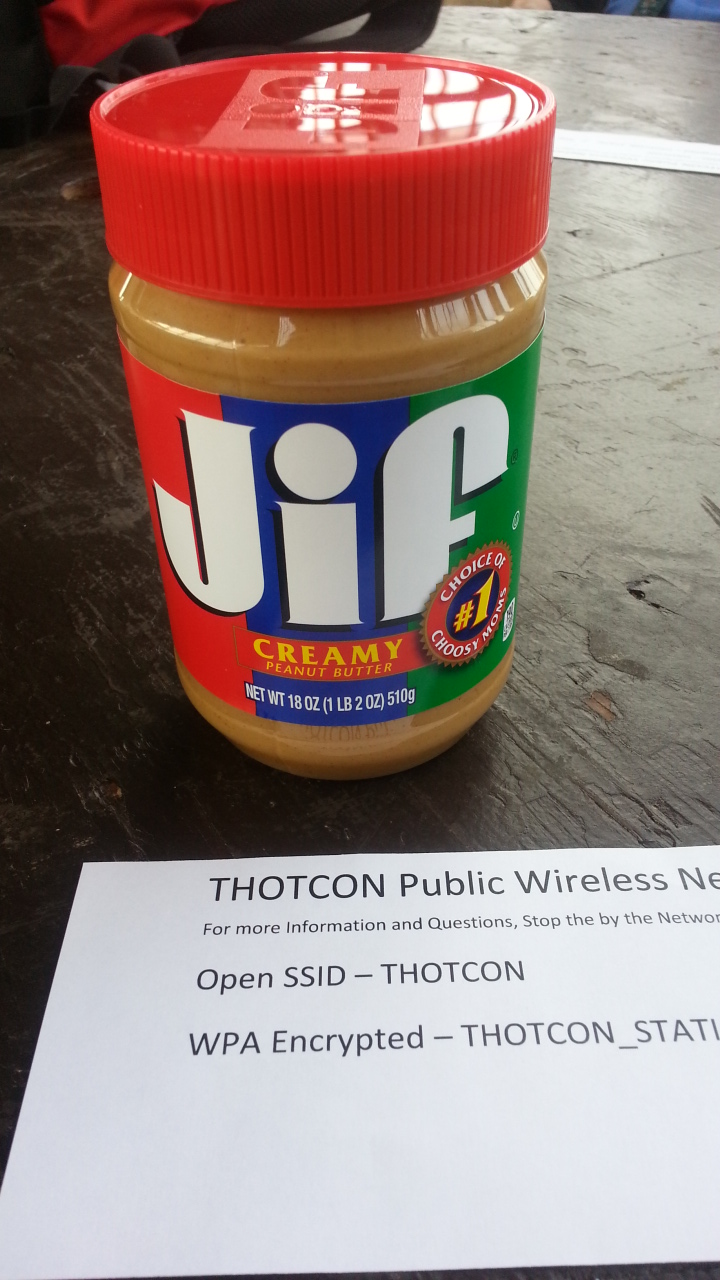 Friday: As happened a few times, the day began with or included a packed cab ride. The immediate surprise was the venue. The Ravenswood Event Center sounds like any other hall for a convention, but in reality is a unique space. Around the main conference room were a variety of old sports cars in immaculate condition. The third floor space reserved for speakers had high glass walls for a bright room with good views. Courtesy of THOTCON staff, the speakers could use this as a lounge for talk preparation, free booze, and a hosted lunch. I ran into Jeff Jarmoc again who delivered on his promise to bring us a jar of peanut butter for a stage prop. The picture of the Jif alongside the THOTCON wireless information was proof for Advanced Threat who doubted my presence in Chicago. Not to be outdone by Jarmoc, Banshee produced a stuffed squirrel who could enjoy the jar.