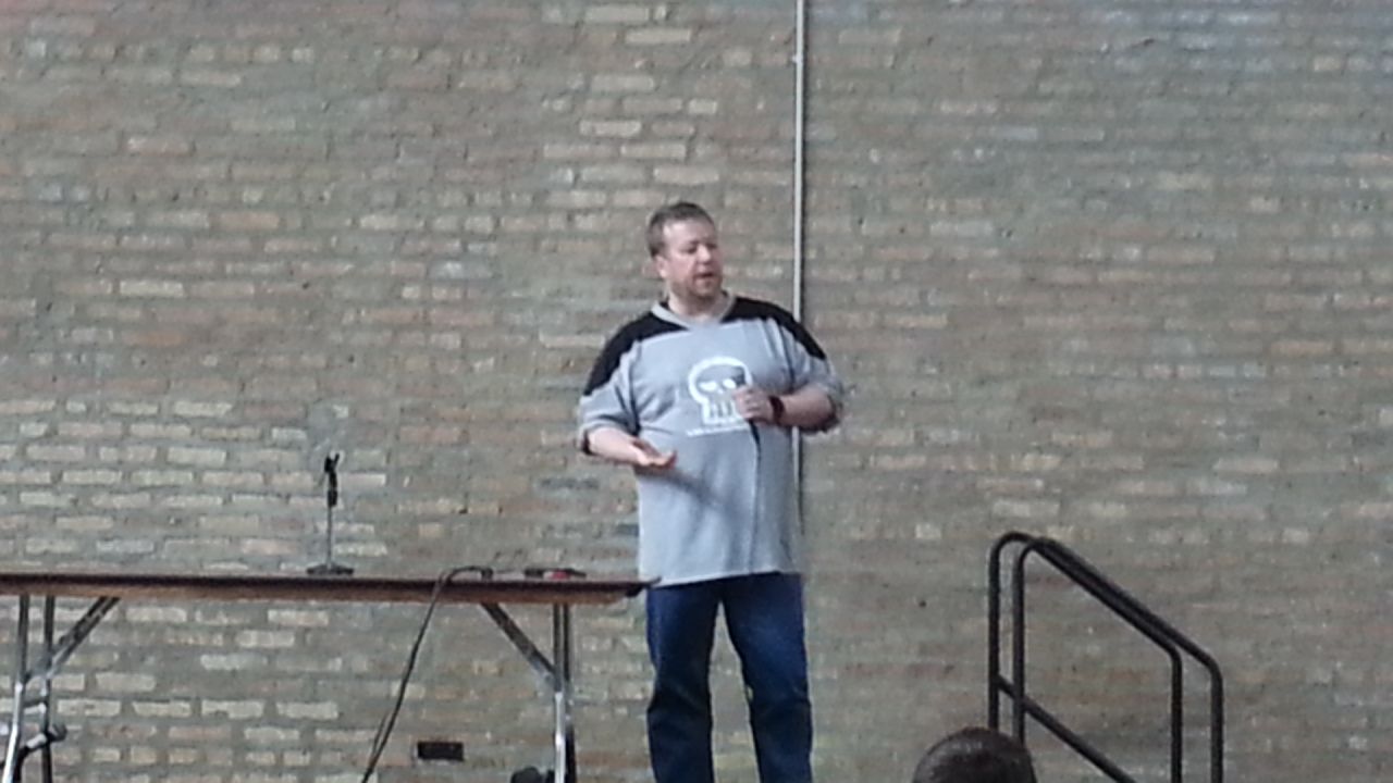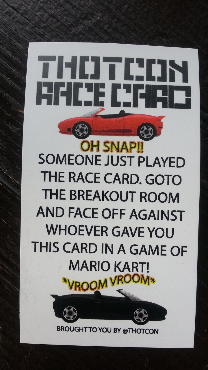 The first keynote of the day was by Bruce Schneier, who treated the audience like a bunch of eight-year olds, going into the very basics of social contract by stretching it out 30 minutes via the speaking method of “repeat yourself using different words seventeen times”. Josh and I were both groaning throughout his presentation and I opted to take a ‘meta’ picture by photographing the event photographer. Of course, any InfoSec conference needs drama, and THOTCON’s was in the form of someone complaining about the “race card” that was being passed around. Of course, it had absolutely nothing to do with race, and everything to do with Mario Kart racing, but that didn’t matter. I thought the cards were hilarious. The other sticker that came with registration was potentially a trigger, but everyone seemed to love it as well as the shirts that said “Fork My Dongle“. Shortly before my talk, I jumped over to Track 2 to see James Arlen present on how to do a better presentation. His very brief talk was a boiled down version of a much longer workshop he gives, and it should be required viewing by anyone presenting, especially in InfoSec.