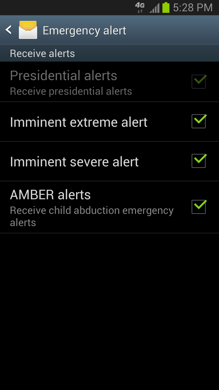 Looking at the SMS options that control this is also interesting. I now have to receive “Presidential Alerts” and cannot opt out of them. There are also Imminent Extreme alerts, Imminent Serious alerts, and the Amber alerts that I have received twice now. What are the others, and what differentiates them? When was the last time a Presidential broadcast was sent to everyone’s email address or home phone number? Absurd you say, why is it all of a sudden OK to send them to every subscriber’s cell phone?