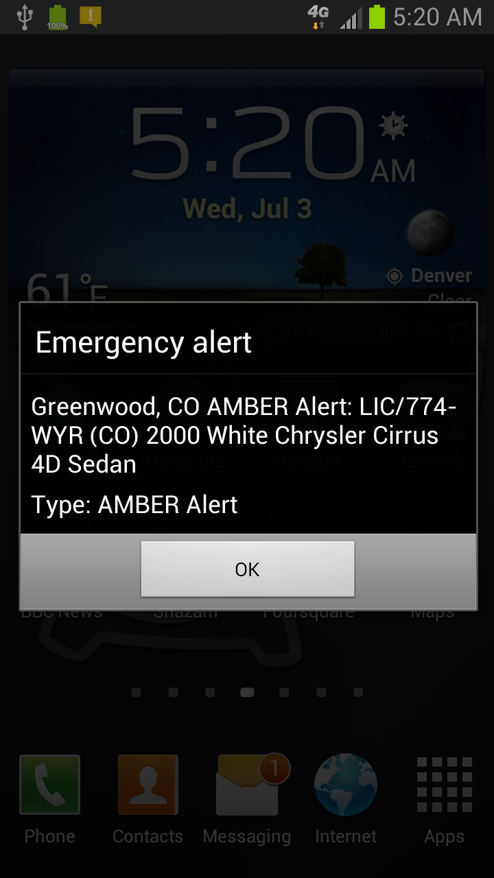 Just over a month ago, I received a pop-up alert on my Samsung Galaxy 3 (via T-Mobile) with a standard, and persistent, emergency broadcast noise…