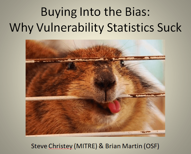 Steve Christey, the CVE Editor from MITRE, and I gave a presentation at Black Hat Briefings 2013 on the problems we have witnessed over the years with poor vulnerability statistics. Rather than just debunk a handful, which we did, we also went into extensive detail on the different types of bias that ultimately lead to these bad stats. In addition to showing concrete examples of how the bias plays out, and how a single researcher can significantly impact stats, we also point out examples of ‘good-ish’ stats, since we haven’t seen truly good ones yet. Why? The data sources are so primitive, but they are all we have right now. In addition to the the slides presented, we left in over 40 additional working slides that didn’t make the cut. As always, there is additional commentary, references, and notes in the PPT that weren’t seen in the presentation.