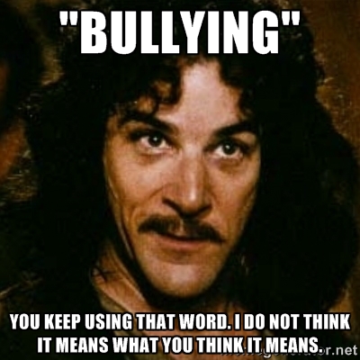 We can certainly agree that the archaic definition isn’t what anyone means when using the term. Similarly, a pimp or hired ruffian is probably just as archaic and not intended. Focusing on the rest you have a variety of definitions that range from “treat abusively” to the more dominant that includes the purpose of the activity. The words threat, force, and coercion appear more than once in the definitions above and are the crux of what bullying is about. Everyone who is now equating the term “bullying” with anything less than a malicious, sustained campaigns of hatefulness with the intent of coercing/threatening is the worst sort of cowardice and dishonesty. They are doing a disservice to society and themselves.
