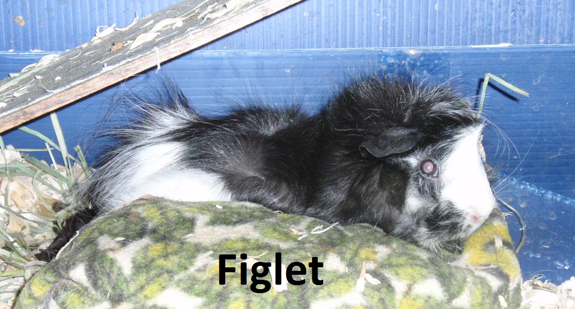 Figlet, originally Willow aka A762196, was a female Abyssinian (likely with a peruvian mix) adopted from the Humane Society of the Pike’s Peak Region on June 20, 2008. Originally down there to adopt another ‘female’, we found two large males with health problems. Despite correcting the shelter on the gender of the pigs, they didn’t appear to care or update the web page days later. Figlet was in a large cage by herself (good), but with half of it covered in water-soaked litter and no water in her bottle. Almost unable to hold her, we managed to get her in the carrier and bring her to the pig mansion. She integrated into the herd within hours (after quarantine) and did great. Clearly younger than advertised, Figlet was the most energetic and spastic pig we had. Even six months after adoption, she was almost impossible to hold for more than a few seconds as she tried to escape and find her own footing. Fearless doesn’t begin to describe her. Figlet passed on Oct 15, 2009 due to complications during surgery to remove a mass causing Hyperthyroidism, a rare condition in guinea pigs. A full write-up of diagnosing and treating her was created to share information about this rare condition in pigs. Figlet was ‘my’ pig and I spent a lot of time trying to figure out what was wrong, and went to great lengths to try to help her live a happy life. After losing her, that convinced me that I was not going to rescue any more pigs myself; rather, I would continue to support shelters and rescues.