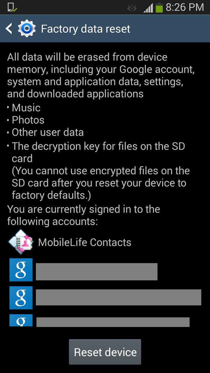 The other day, a relative and I both upgraded our phones. Him from a Galaxy S2 to a S5, and me from a Galaxy S3 to a S5. So I figured why not check both out to see if they did the same. Cliff notes: The Samsung Galaxy S2 (model SGH-T989) ‘factory reset’ leaves a lot of personal information behind, while the Samsung Galaxy S3 (model SGH-T999) does not. It certainly does not delete your content.