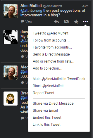 Just about anywhere on this context menu works nicely. “Add/Inherit @AlecMuffet’s blocks…” or “Block @AlecMuffet’s blocks…” or “Share @AlecMuffet’s blocks…”. One click and a confirmation box, and I could take any of his exported blocks and make them my own. That presents a smoother, more easily crowd-sourced model that is the intent here. If I have multiple accounts, it is three clicks as I choose which account (or all accounts) to add blocks to. Compare that 2 or 3-click method, with the one Twitter came up with. Designing the “User Experience” (UX) is an art, and not many companies do it well. It is often due to the disconnect between how the developers use a product or service and how their users or customers use it.