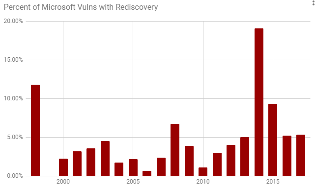 With RAND’s closed dataset, and Herr et al’s dataset created on open data (but not distributed with the paper), RBS thought it would be interesting to offer a dataset focused on Microsoft that is open and available. It was created to show that serious bias can be introduced based on a given data set. We are not stating that this dataset is accurate and any other is not; simply that many factors must be considered when creating vulnerability statistics. Without their datasets published, other researchers cannot validate their paper’s findings or build on their data. While the RBS dataset is being made available, it is a draft / proof-of-concept more than anything. The dataset, titled “PoC Vuln Rediscovery Dataset Using Microsoft Creditee Data“, has additional notes and caveats to illustrate some of the pitfalls when performing this type of research.