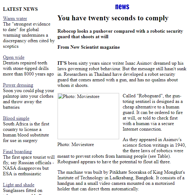 While the Internet is enjoying and mourning poor Steve, everyone seems to forget about old ‘Roboguard’! Unfortunately, like most media outlets, even “New Scientist” doesn’t preserve links and evidence like a scientist would. These asshats don’t even clearly list a date on their articles (posted to ISN on Aug 31, 2000). Thanks to the Internet Archive, if we go back far enough we see the article but without pictures, likely because “New Scientist” didn’t want to preserve anything back then, like they don’t today. I don’t think “science” means what they think it means.