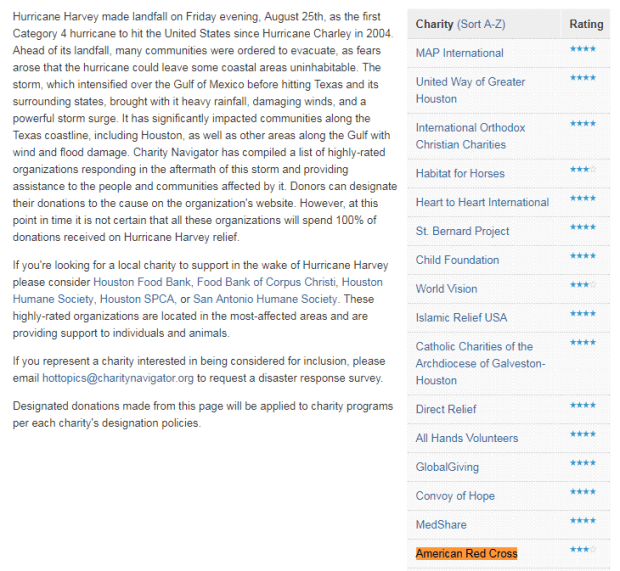 First, know that I am not only one who donates to charity who is careful where we donate, but I have learned the hard way that not all charities are created equal. I’ve also pointed out how so many of them waste considerable money trying to solicit more donations. I’ve advocated for everyone who will listen to tap into Amazon’s excellent program for giving to charity via your own purchases. I’ve also considered this at a slightly more abstract levels, on smaller amounts, because I really believe that people in a position to help should do so. Please, before you come down on me for warning someone away from charity or Red Cross specifically, I have been very clear it is about supporting charities doing the work you support. In this case, I just wanted to find which charities are specifically helping hurricane Harvey victims, and how.