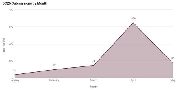 A recurring theme in these blogs and our Tweets throughout the CFP process is strong encouragement to submit early. While we did get a share of submissions in January and February, you can still the huge spike we experience in April (a majority a day before CFP closed), and May (on the day it closed). The two weeks between the end of CFP and the time when acceptance/rejection letters are sent out become stressful as we’re under deadline to review talks, try to get last minute feedback when we can, and make final decisions.