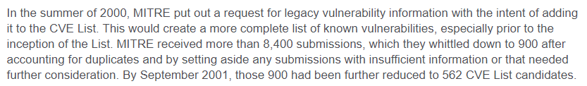 If there is anyone at MITRE open to outright bribery, including all-you-can-eat sushi dinners, I will pay a bounty to get my hands on that list of 8,400 submissions! While I know there are likely a lot of duplicates, the vulnerability historian in me would love to audit that data to see if MITRE decided to skip any that would be considered vulnerabilities by today’s standards, or where someone else back then had more knowledge of a vulnerability than was submitted. That data is over twenty years old and was solicited, processed, and partially published with U.S. taxpayer funded money. There’s no reason not to make it public. =)