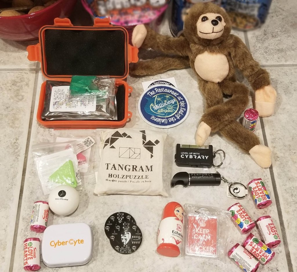 After throwing stickers in the air like I found new wealth I dug into the box more. The w1bble already knows I dig those “love hearts” candy after my last trip to his fruity country. Think along the lines of sweet tarts… that fizz a bit. Also included, and part of just about every box in history, is vendor swag. A suave monkey, puzzle I will send off to have done for me, “dodgy bluetooth trackers” as he calls them, mints for me to freshen up, and a smaller nicer box with more shit in it. The two circuit board thingies were “beer tokens @ 44CON, they got soldered onsite and were more interesting ..“.