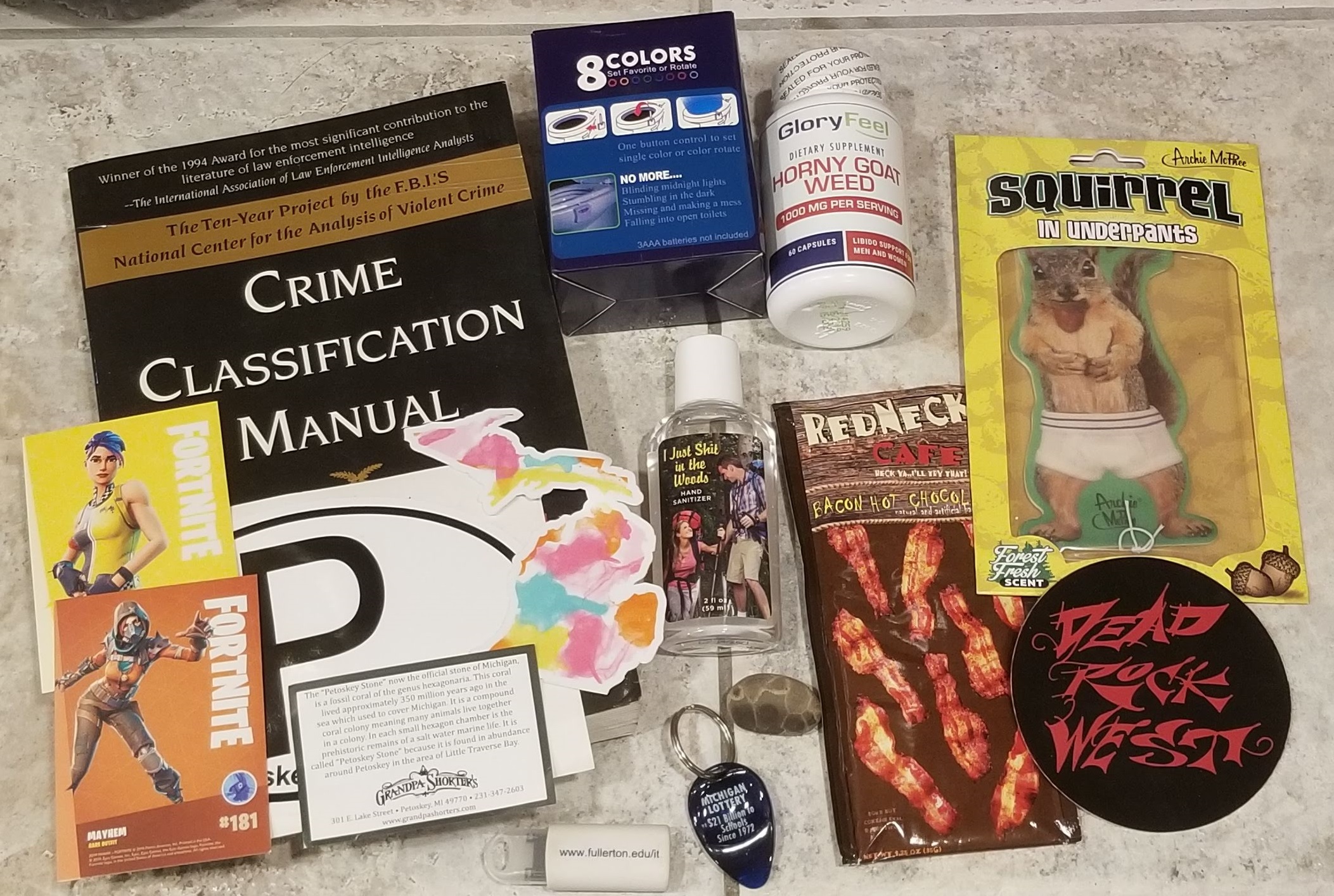 The “Squirrel in Underpants” air freshener is a nice touch. He sent it to me after it hung in his truck for two years never making it smell better. I appreciate the unwrapped gifts like this.
