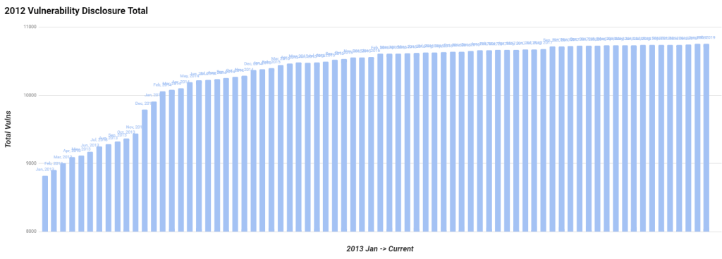 With this visual we can see that in the years after 2012, vulnerability aggregation continued to rise considerably. Over time that growth tapers off as the team simply didn’t have time to keep digging that far back into changelogs and bug trackers looking for more vulnerabilities that were less beneficial to organizations.