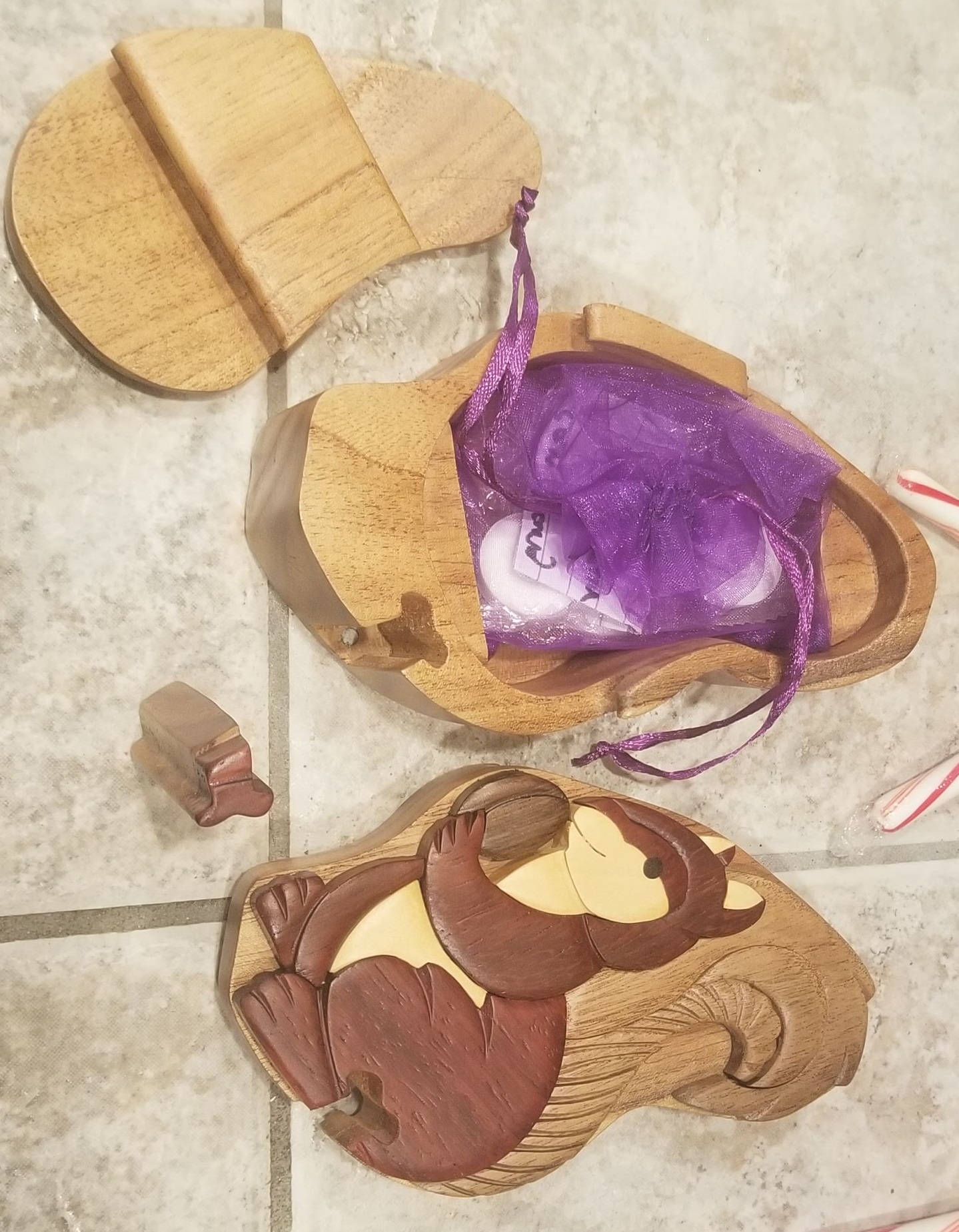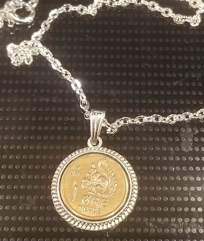 This one was a two-fer! First, an amazing squirrel puzzle box that I have never seen! Once opened, it came with some breath mints or the largest Quaaludes you’ve ever seen. TBD. Along with those was this great necklace that features a 1 Øre coin from Norway, known for it’s prominent squirrel featured. Most people who have received a box or envelope of shit from me have received one of these coins, but never in such great condition and never as part of a necklace. Some people wear patron saint necklaces and now I have my own.