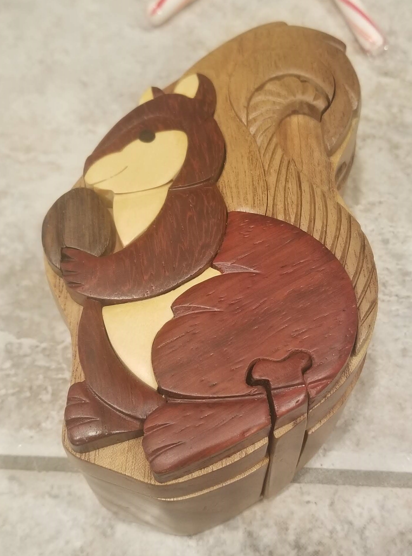 Four individually wrapped presents, a cloth sack, and four hidden candy canes surrounded by little strands of tissue ribbon worms that kind of haunt my dreams now. I found two going through my desk drawers this morning. The lush squirrels toasting the holidays were a nice touch but I think they are controlling the worms now. Do they look innocent to you?!