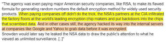- Second line is problematic as Perlroth writes that the CIA infiltrated factory floors at “leading encryption chip makers” to backdoor them, but does not offer a citation. Given that it follows a voluntary backdoor in RSA, it is a separate series of events. The wording also does not match the well-known Crytpo AG saga. Given the severity of such incidents, it seems like this would come with a reference.