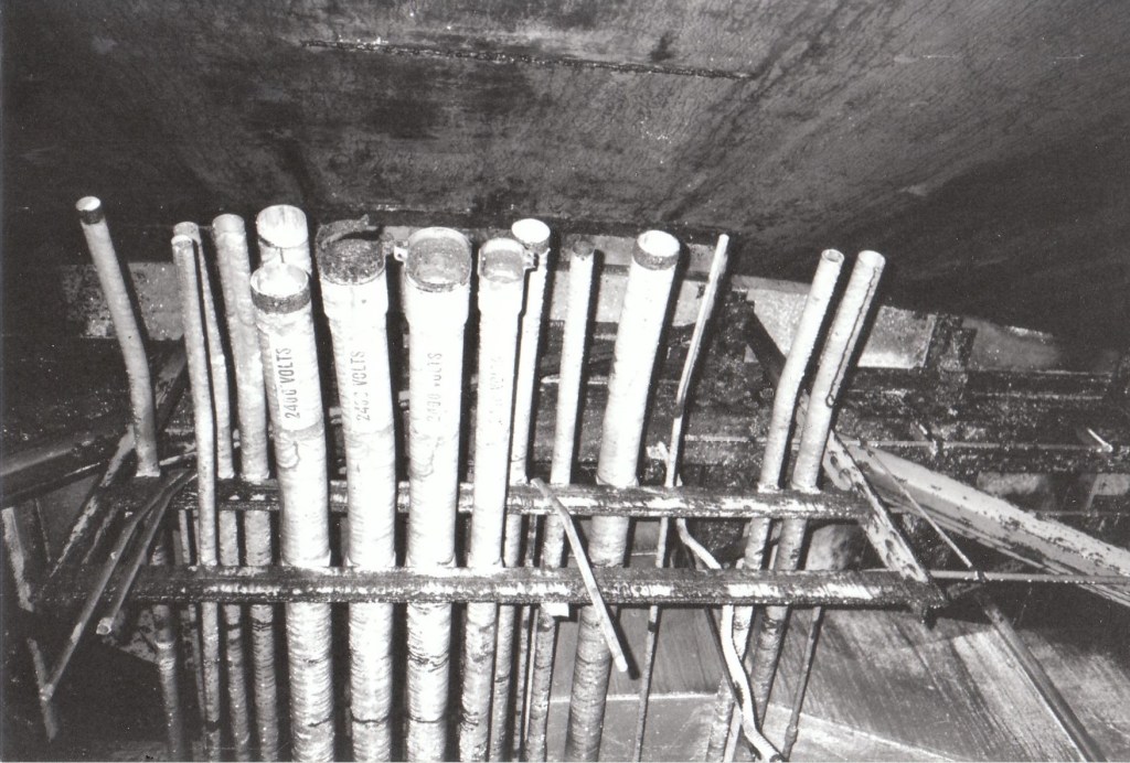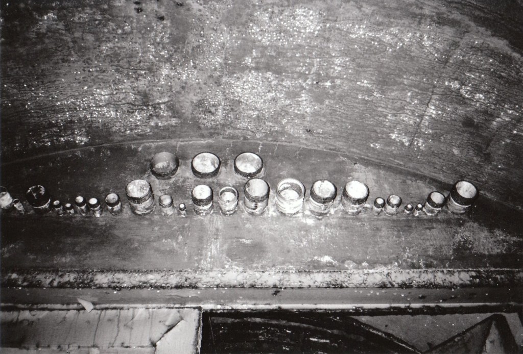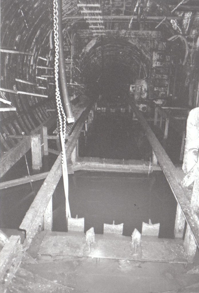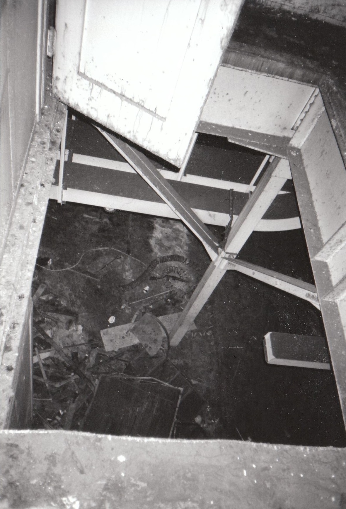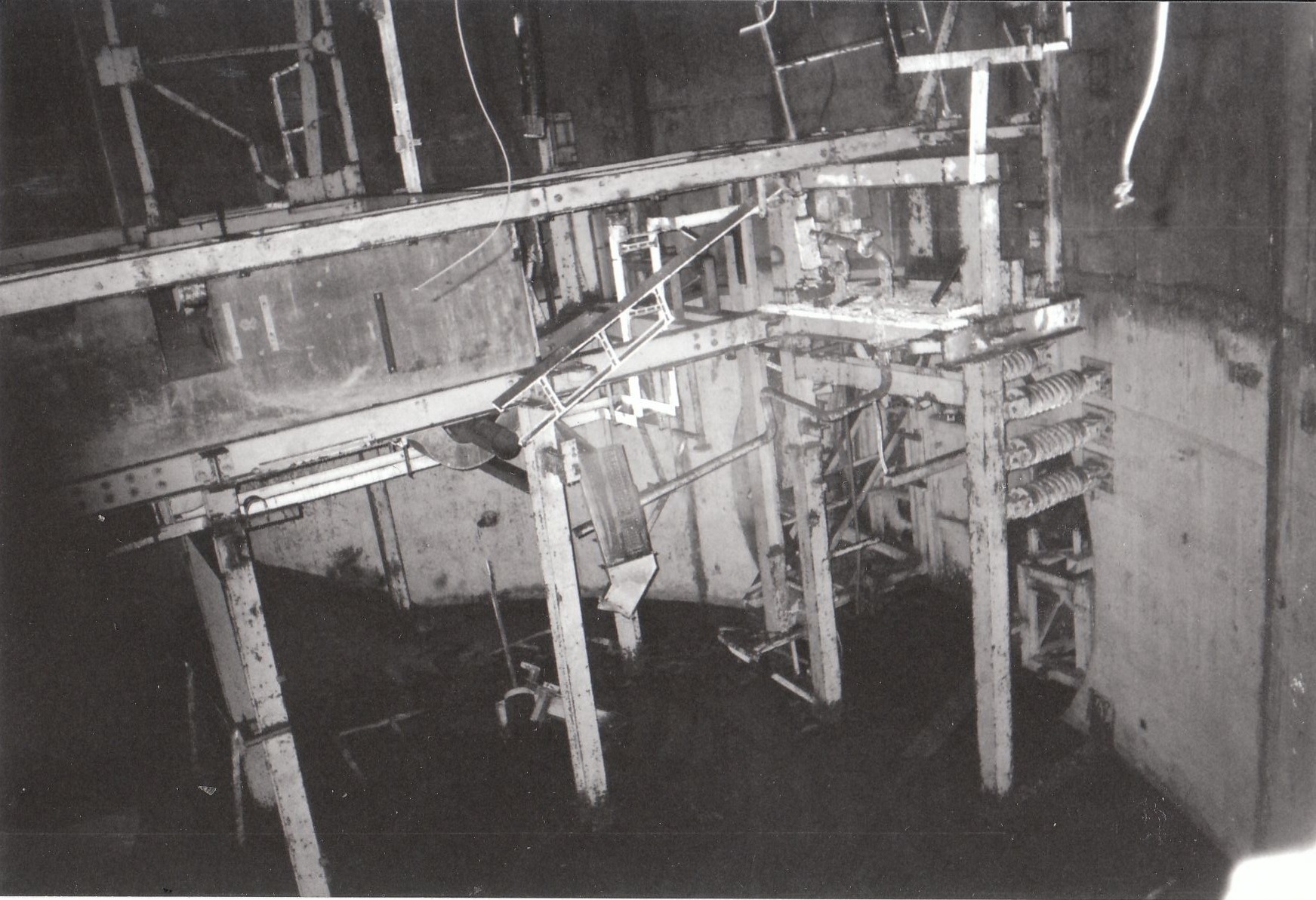 To get to the silo at the end of one tunnel, we had to cross on of the two beams that previously supported heavy metal grate flooring (pictured below). The flooring had been ripped out and the tunnel was flooded. One of the silos was ~ 1/3rd full of water, another over half. Just looking over the edge into the water not knowing how deep it was was disconcerting. It was too dark to get a good picture; remember, this was with a conventional camera and due to the facility, the flash white-washed the image.
