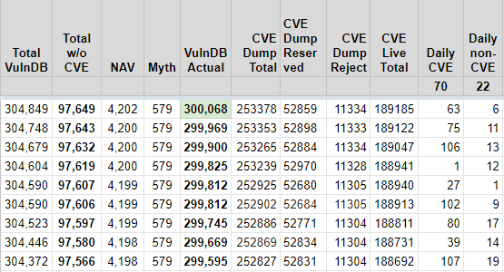 First, this is extremely pedantic and I know that! But that is the world vulnerability database nerds live. We have the most pedantic discussions you can imagine, and then some a lot more than that. The Flashpoint blog says that we aggregated 300k vulnerabilities as of that day, and we did… kind of, sort of.