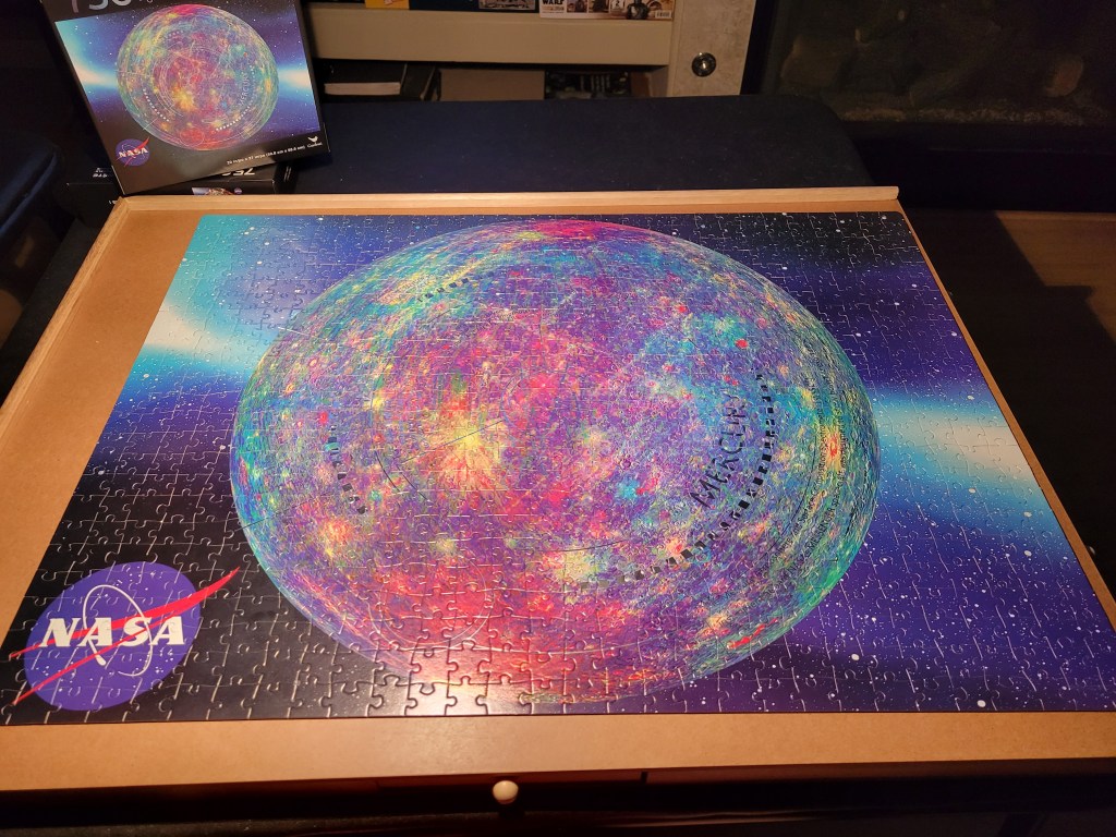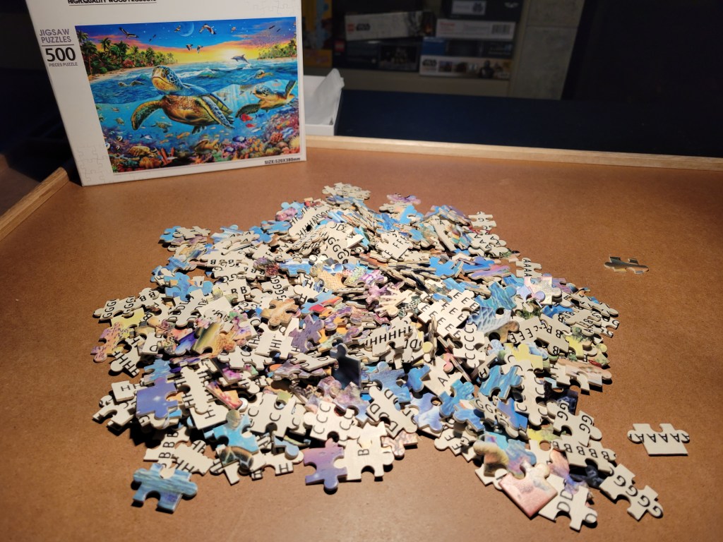 High Quality … – So these are actually different brands and a cautionary tale! On the left is “High Quality Wood Puzzles” brand, with their “Planets” puzzle. The pieces are not wood, more a composite plastic. You can see in this close-up that the pieces can come warped and not fit smoothly. In the middle is “High Quality Wood Products”, note the difference of ‘Puzzles’ vs ‘Products’. This puzzle was fine, but a composite plastic piece again. The upside is the colors tend to be quite vibrant. The ‘Turtle’ puzzle was also pretty easy and would be a good introductory puzzle. Finally, on the right is probably the most difficult puzzle I have done yet. Note the shape of the pieces are distinct, which isn’t a big deal. However, a lot of them didn’t actually lock. Every time you slid a piece into place the puzzle would move and shift. Keeping it together while you build is challenging. The color looks fairly vibrant here, but in reality it was dark and muted and required a bright light just a foot over the table to clearly make out colors and shapes.