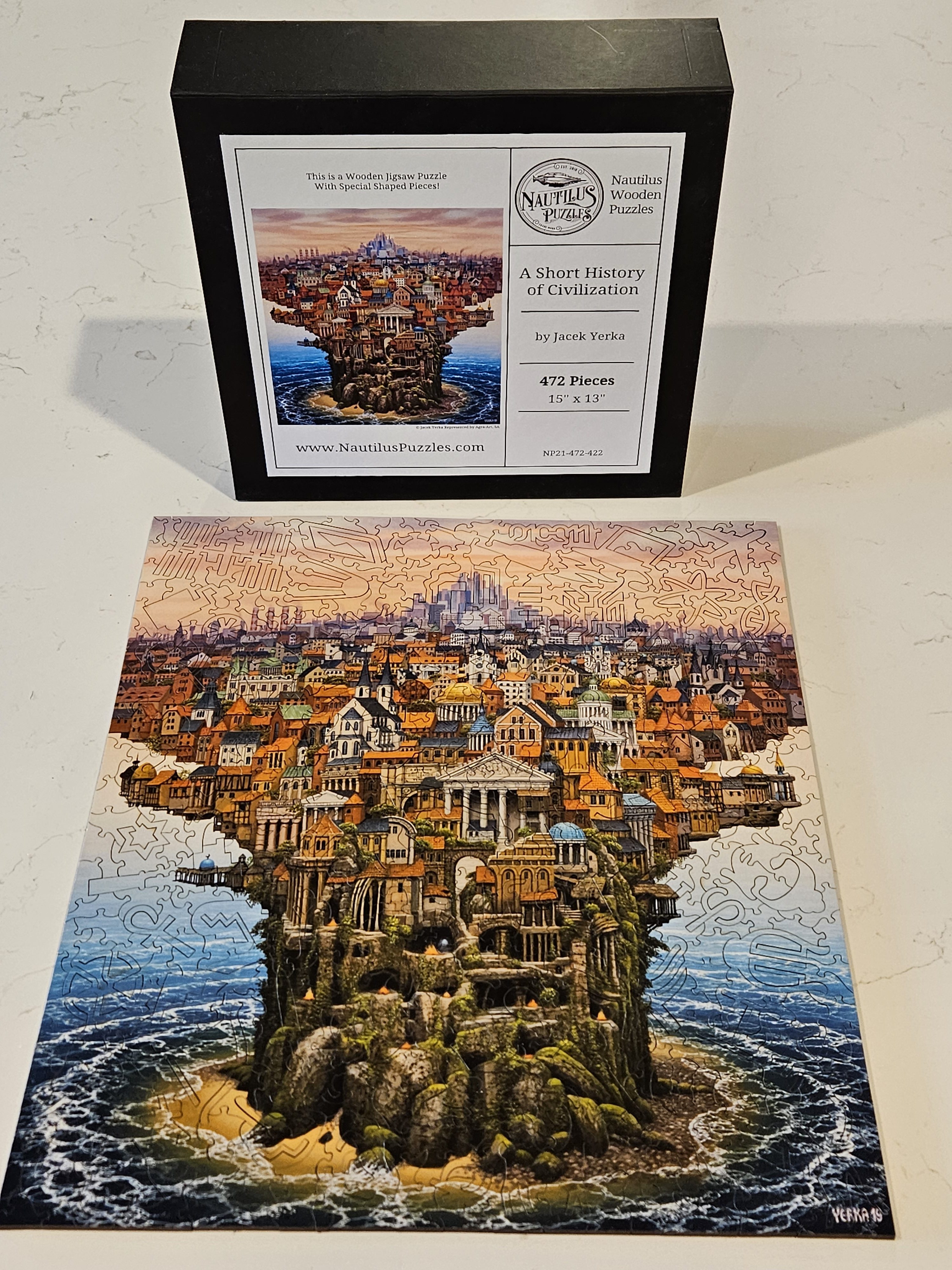 Nautilus Puzzles – These are interesting for a couple reasons. First, the difference between their low-count puzzle pieces and higher count is distinct. The lower count are more a plastic laminate than wood, where the higher count are the traditional wood. For the “A Short History of Civilization” puzzle on the left, this was creative in that it literally builds on the history showing housing and eventually technology as you get higher on the puzzle. The lower count puzzles are another that are great as an introductory to these types of puzzles.