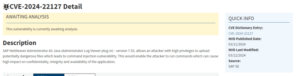 Second, I simply do not think this is an accurate statement. Saying that NVD is covering Patch Tuesday is deceptive at best. Unless she was using a different meaning for “taking care of”, then looking at the March 12 Patch Tuesday, over two weeks ago, we see plenty of Adobe that are awaiting analysis. Moving to Microsoft, we see the same thing. SAP? Yep, once again awaiting analysis. You cannot say a database is “taking care of priority things”, specifically call out Patch Tuesday, and not have analyzed those vulnerabilities from weeks ago. That is why so many people are confused and frustrated with NVD right now; they aren’t doing the minimum required analysis for high-profile issues.