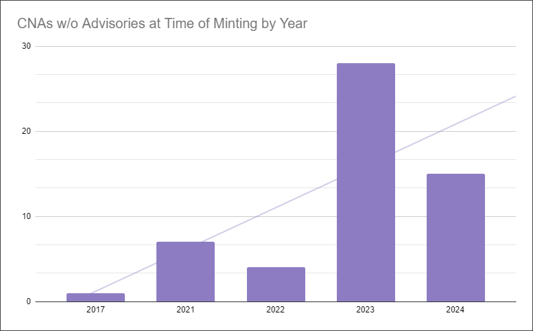 [8/16/2024 Update: Ironically, two of the three CNAs minted this week had no advisories at time of minting. However, one of them has prior disclosures and did not convert their blogs into advisories and populate the page. The third had a single disclosure, just a link to a CVE entry, and not their own advisory.]