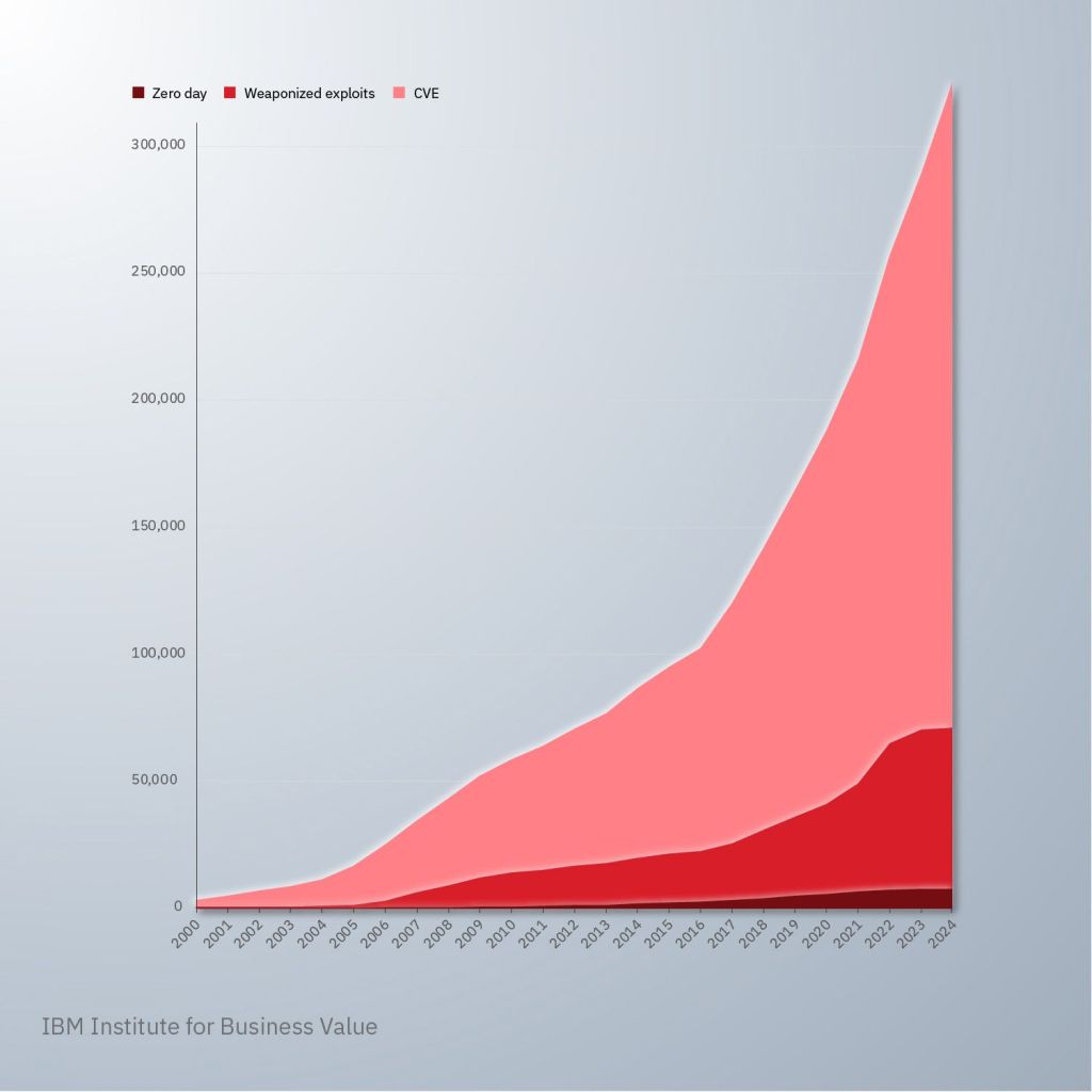 In the “Growth of vulnerabilities, weaponized exploits, and zero days” section, the first chart shows that in 2024 there are considerably more than 300,000 CVEs: