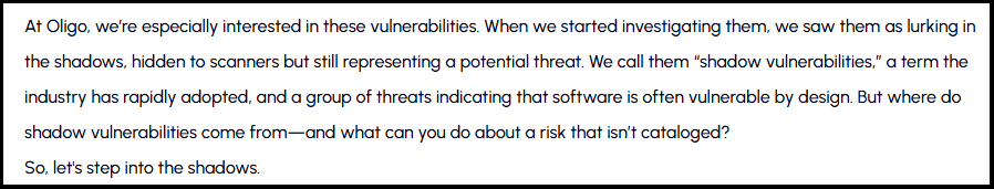 That blog, titled “Vulnerable By Design: Understanding Shadow Vulnerabilities” defines the problem in their minds, and despite that absolute title, quickly and quietly disclaim it as “sometimes” by the fourth paragraph. So they are actually talking about two different issues, not one. Worse, they go on to set the stage saying: