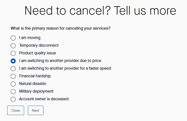 Me: I am trying to cancel service and it will not continue. It asks for a reason, I check one, and then “Next” does not work.