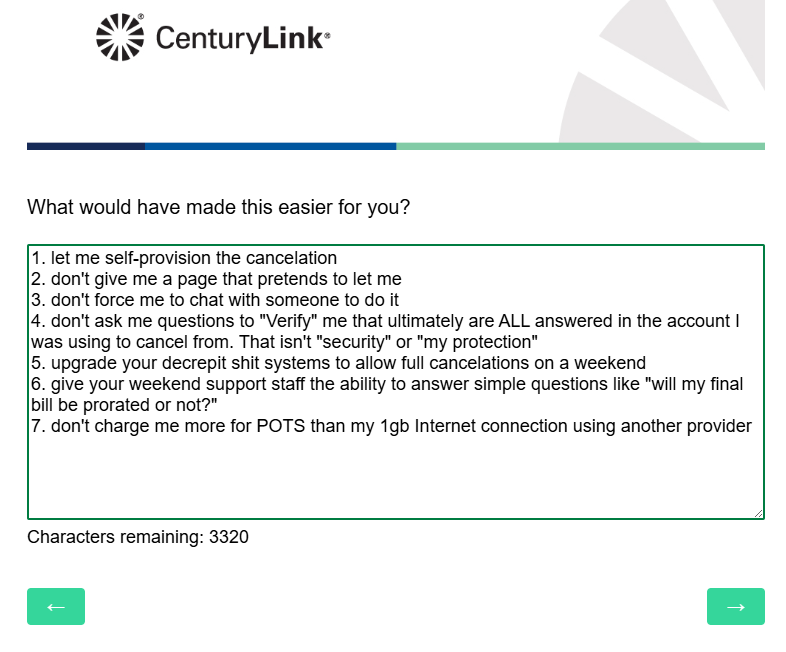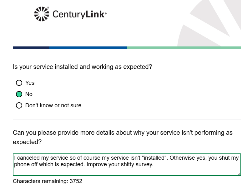 The top question above, is of course good for any scenario. On the other hand, the bottom question is precisely why this survey is further laughable. For CenturyLink to think that 100% of the time, a customer engages with them to have service installed. Never changed, never cancelled apparently? Fortunately, the survey ends with a free-form question that also has a great character limit; enough you could write a blog. If I had more time the night I cancelled, I would have literally written this blog and pasted it into the form before posting. Instead, they get the cliff notes.