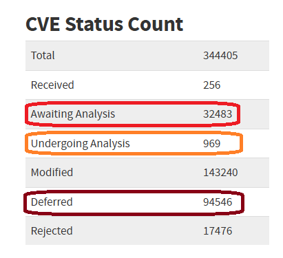 That means we can expect a significant percentage to be disclosed without a CVE ID, or perhaps with one but in RESERVED status. Next, it goes to NVD where the real bottleneck is. As of yesterday, over 32,000 vulnerabilities are awaiting analysis which means almost all of them do not have CVSS scores, and they do not have CPE which allows for programmatic consumption by tools. Basically, you can’t operationalize this data yet. There are almost another 1,000 that are undergoing analysis and not ready, and over 94,000 that NVD has deemed “we’re likely to never touch again”.